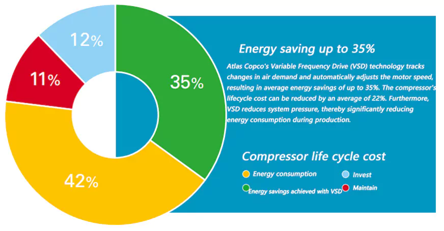 Penggunaan tenaga menyumbang lebih 80% daripada jumlah kos kitaran hayat Pemampat Udara Skru Bebas Minyak. Tambahan pula, tenaga elektrik yang digunakan dalam pengeluaran udara termampat menyumbang lebih 40% daripada jumlah kos elektrik sebuah kilang. Untuk mengurangkan kos tenaga, Atlas Copco mempelopori teknologi Pemacu Frekuensi Berubah (VSD) dalam industri udara termampat. VSD bukan sahaja menjimatkan sejumlah besar tenaga tetapi juga melindungi alam sekitar untuk generasi akan datang. Terima kasih kepada pelaburan berterusan dalam teknologi ini, Atlas Copco mampu menawarkan rangkaian terluas pemampat VSD bersepadu di pasaran.