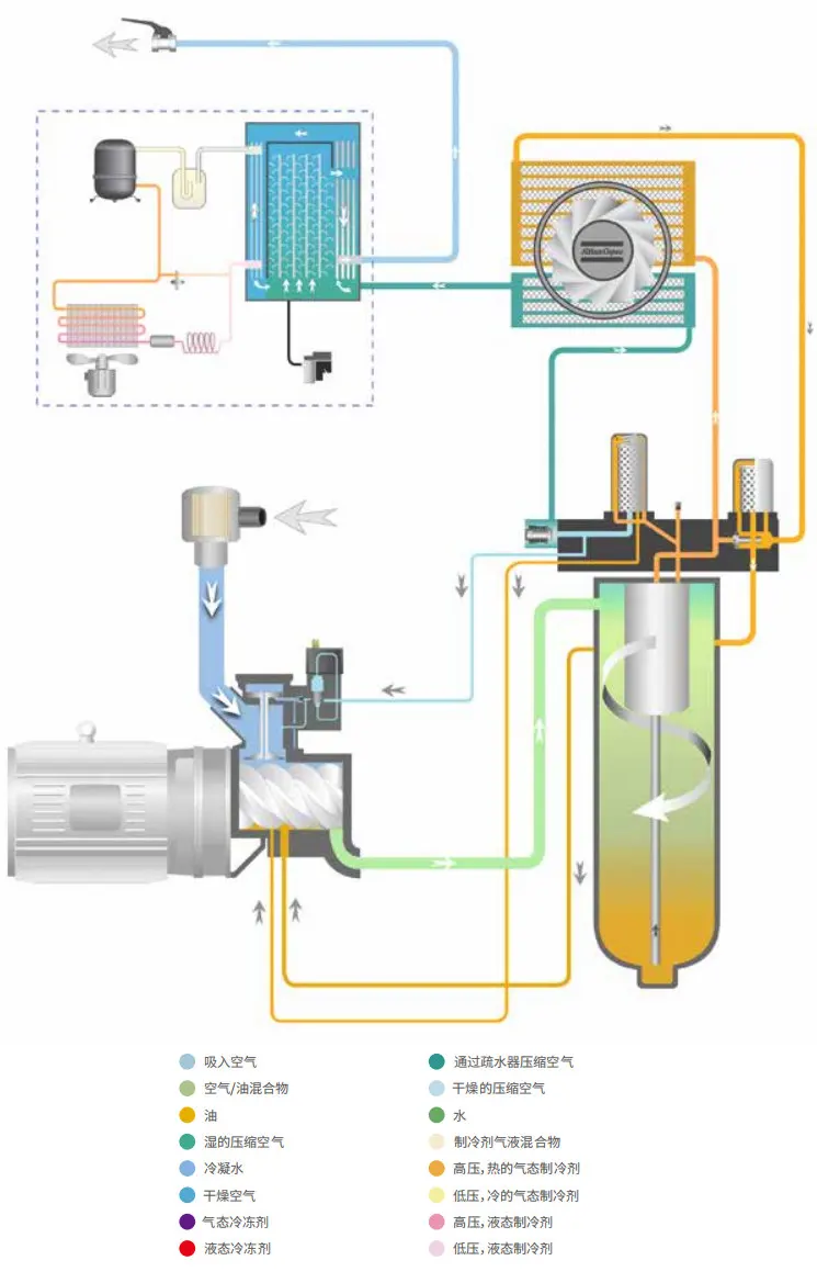 · Kipas penyejuk bebas, penyejuk kecekapan tinggi, dan pengering terbina dalam dengan tekanan titik embun 5℃ untuk mengelakkan kondensat dan kakisan paip dengan lebih baik dalam rangkaian paip